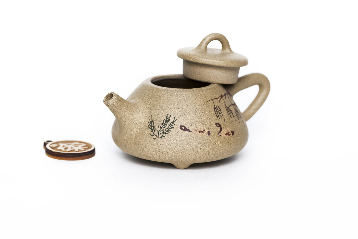 Особенность чайника в росписи глиной на его теле. Маленький объём чайника подходит для заваривания шу пуэров или для заваривания по чаочжоускому методу.